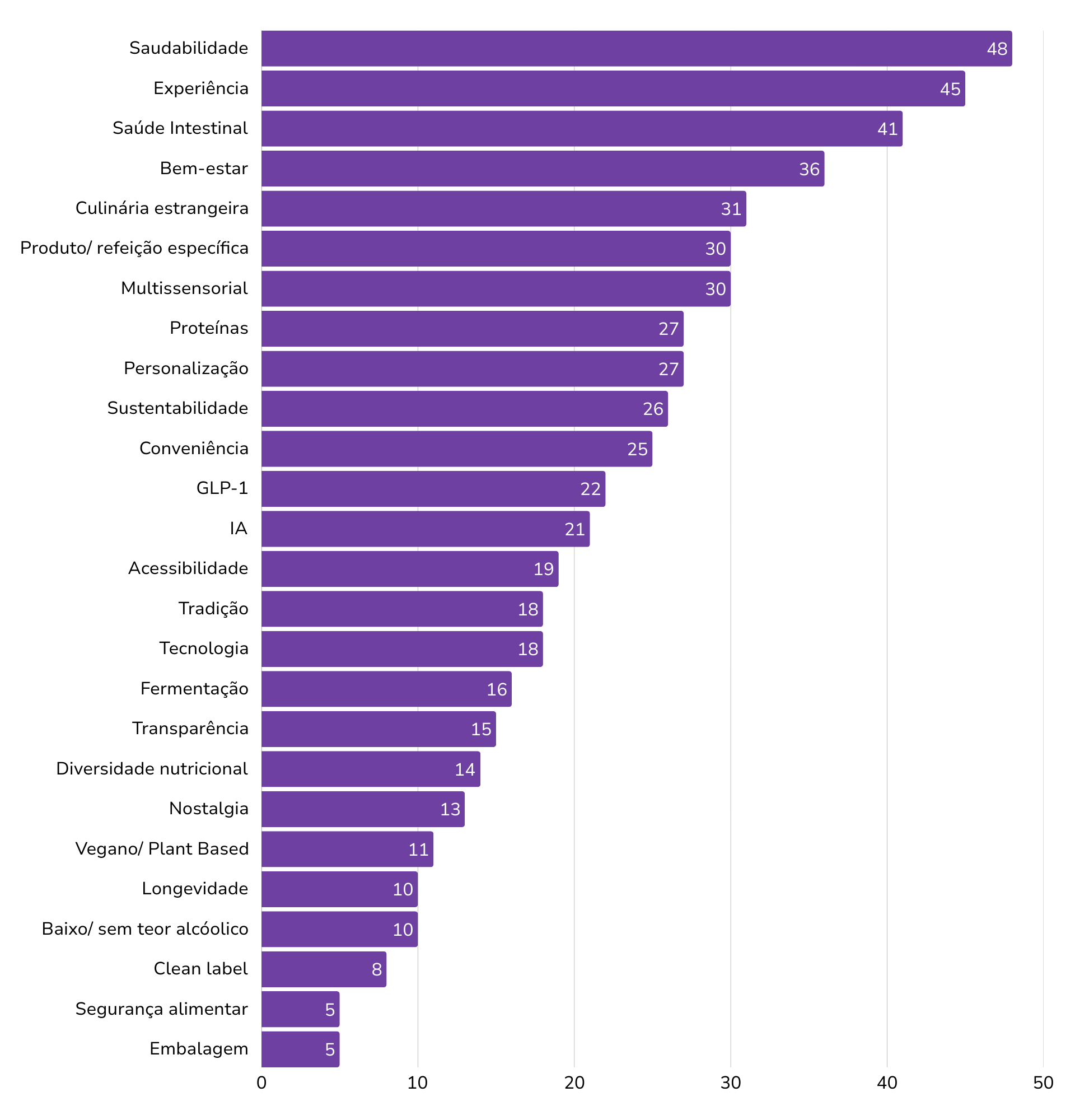 A saúde intestinal (n = 41) se tornou muito importante, aumentando a procura e o consumo de alimentos funcionais ao redor do mundo, especialmente aqueles que são ricos em prebióticos, probióticos e pós bióticos. Esses produtos não estão ligados somente à digestão, mas também à imunidade e ao equilíbrio emocional da população mundial, mostrando uma visão mais integrada da saúde. O conceito de bem-estar (n = 36)  se expande e inclui alimentos que ajudam a lidar com rotinas intensas, ajudando a reduzir o estresse e promovendo uma melhora na qualidade de vida. Para contribuir com essas mudanças, a busca por experiências (n = 45) se intensifica: sabores diferenciados, narrativas autênticas e a valorização da culinária estrangeira (n = 31) despertam curiosidade e ampliam o repertório gastronômico do consumidor. Esses fatores se interligam e convergem para a principal macrotendência de 2026: que é a saudabilidade (n = 48) compreendida de maneira ampla, funcional e em sintonia com o mercado consumidor.